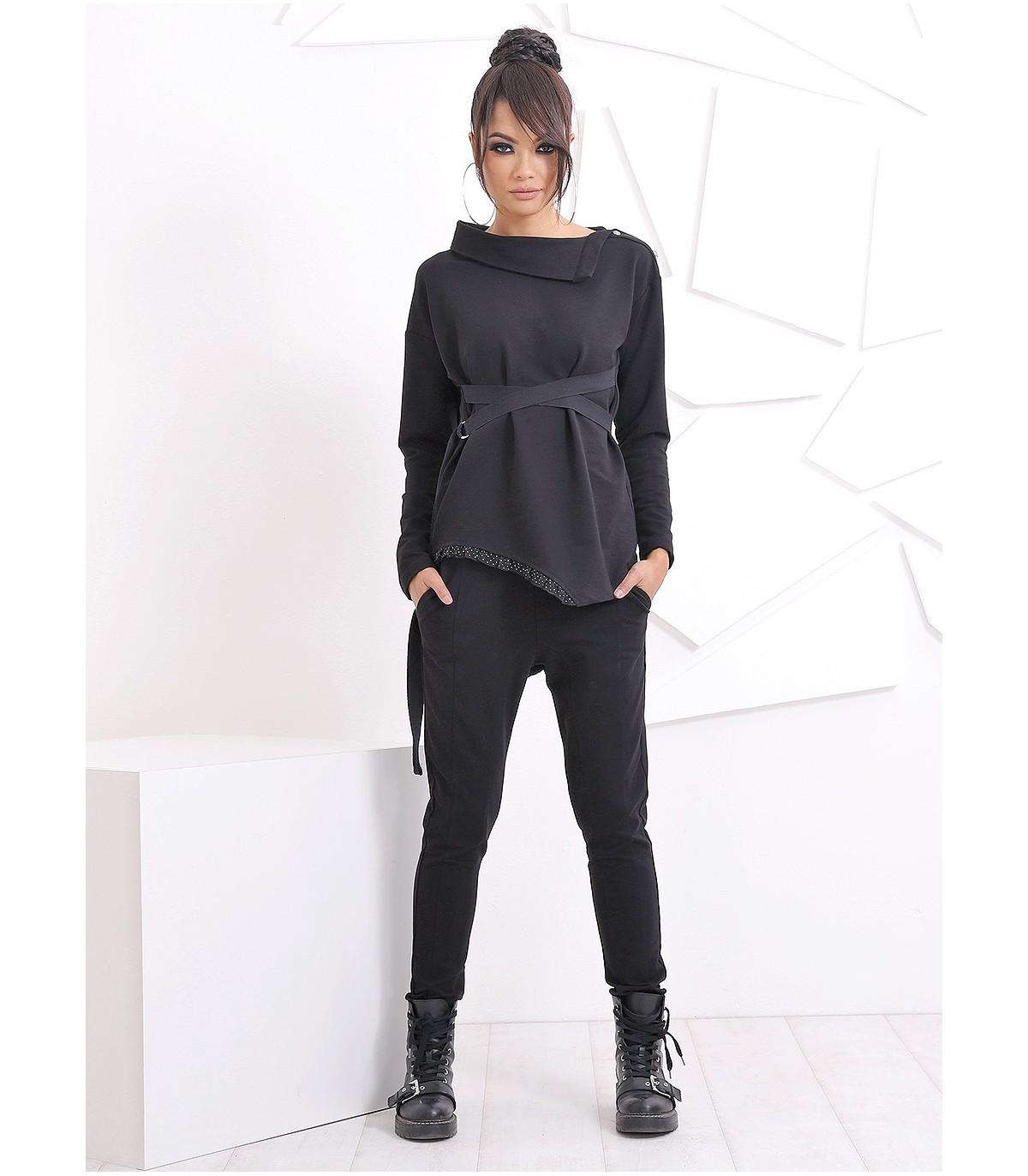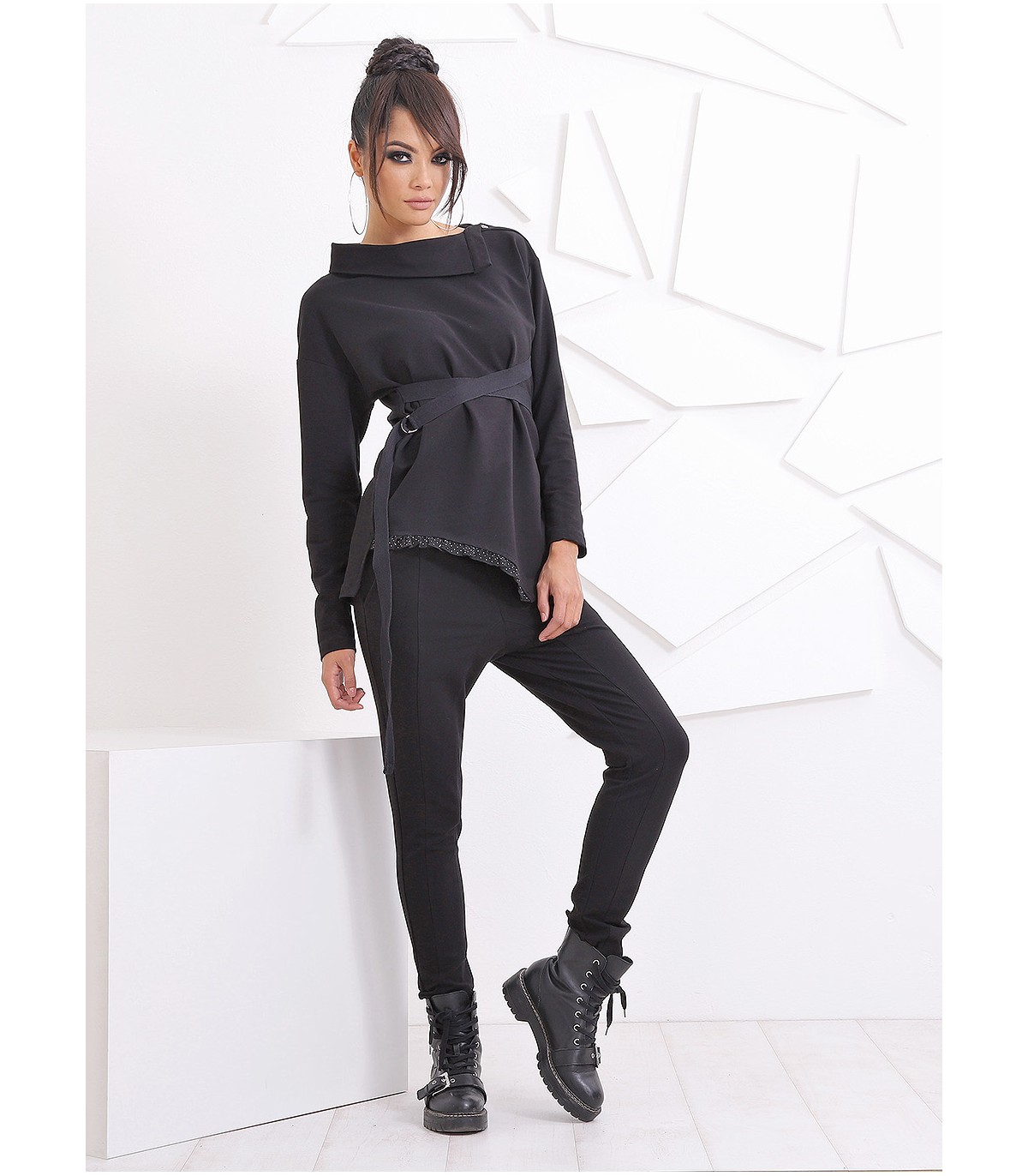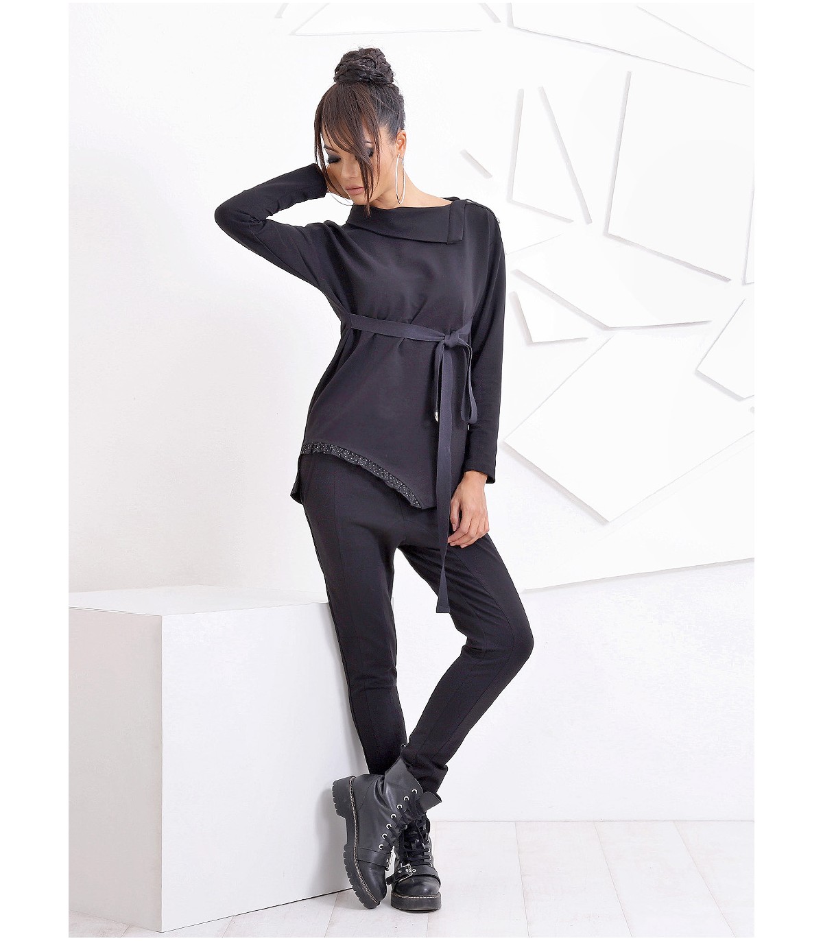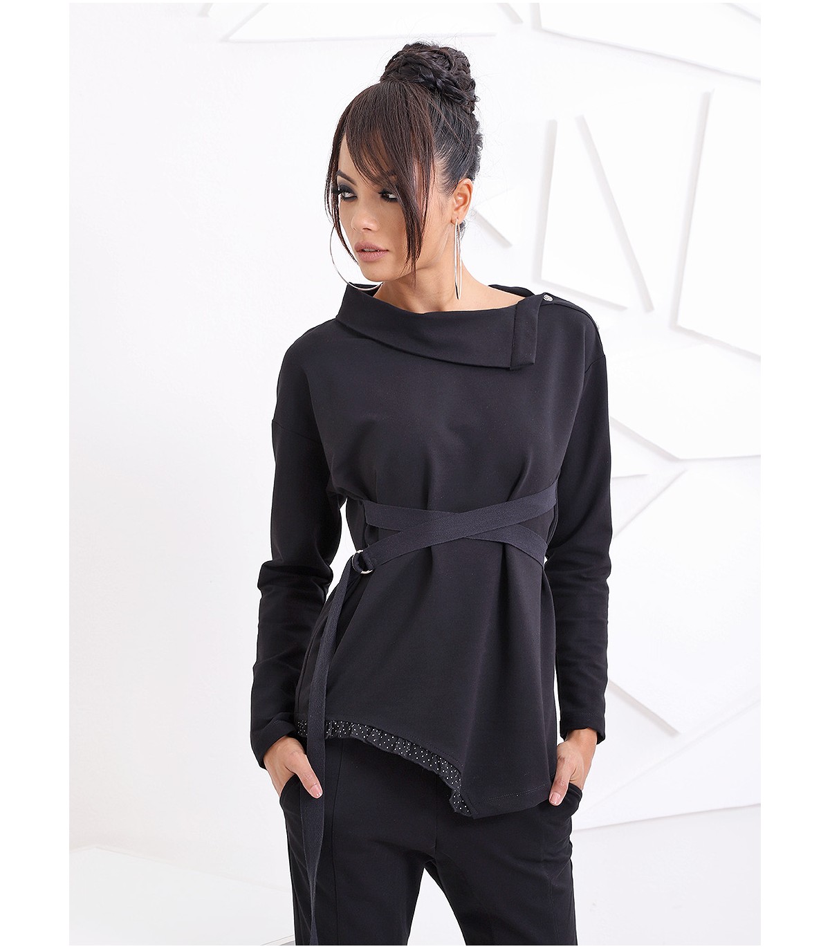 Модерен асиметричен черен топ с декоративни ленти-колан и урбан силует. Комфортен, стилен и подходящ за ежедневни, артистични и градски визии.