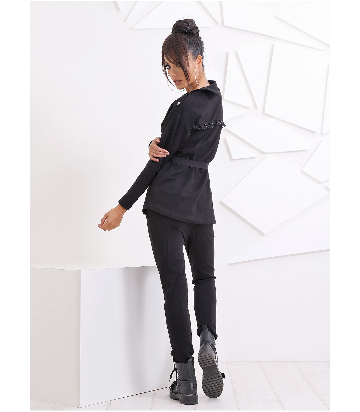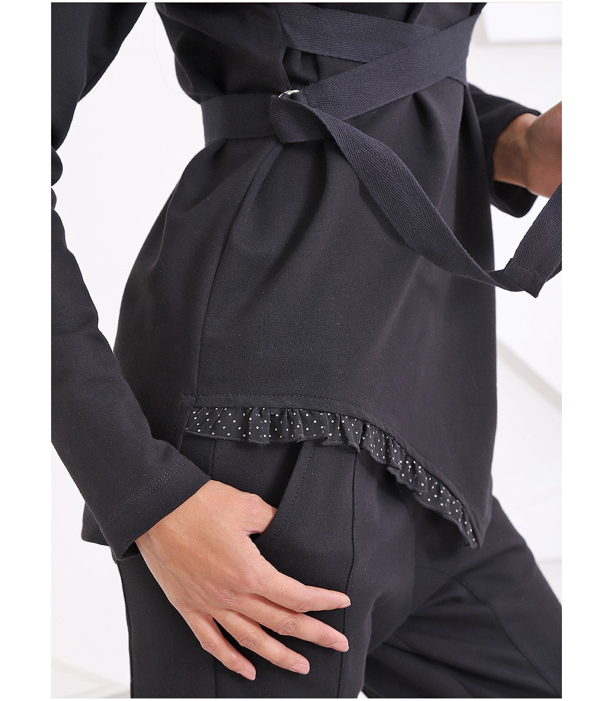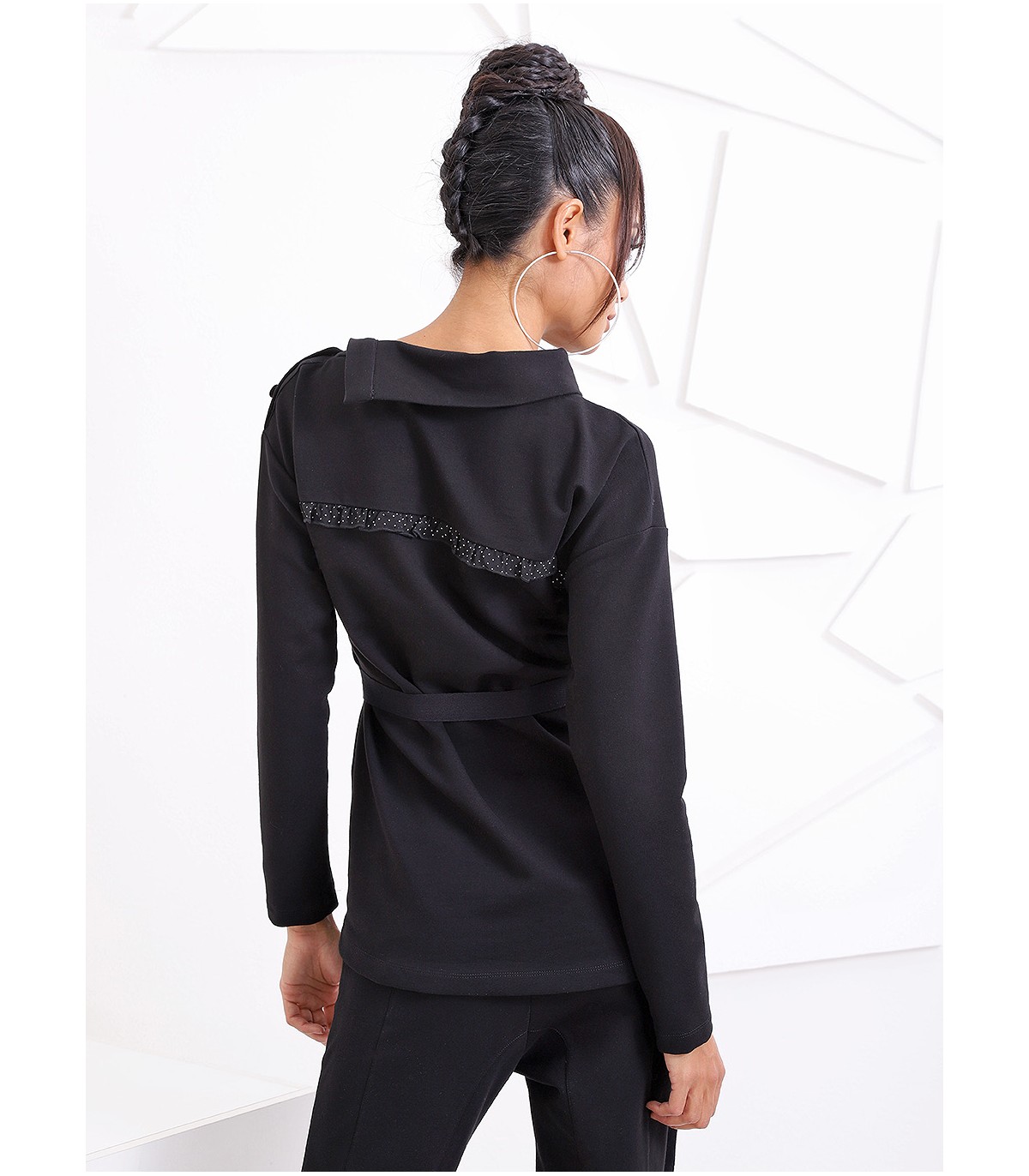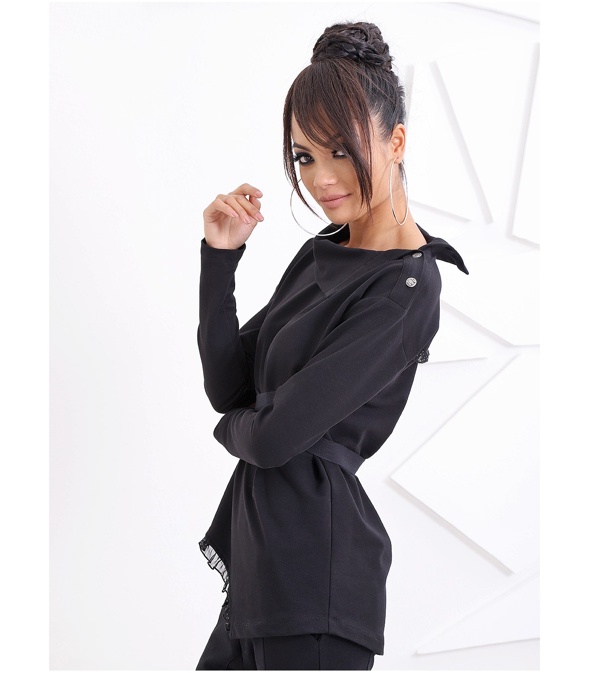 Модерен асиметричен черен топ с декоративни ленти-колан и урбан силует. Комфортен, стилен и подходящ за ежедневни, артистични и градски визии.