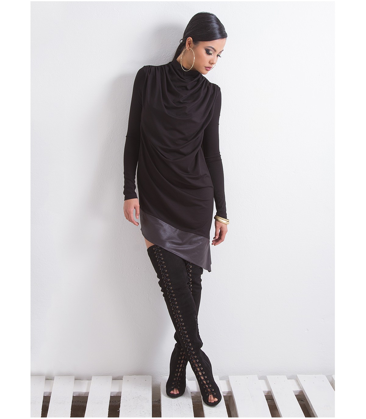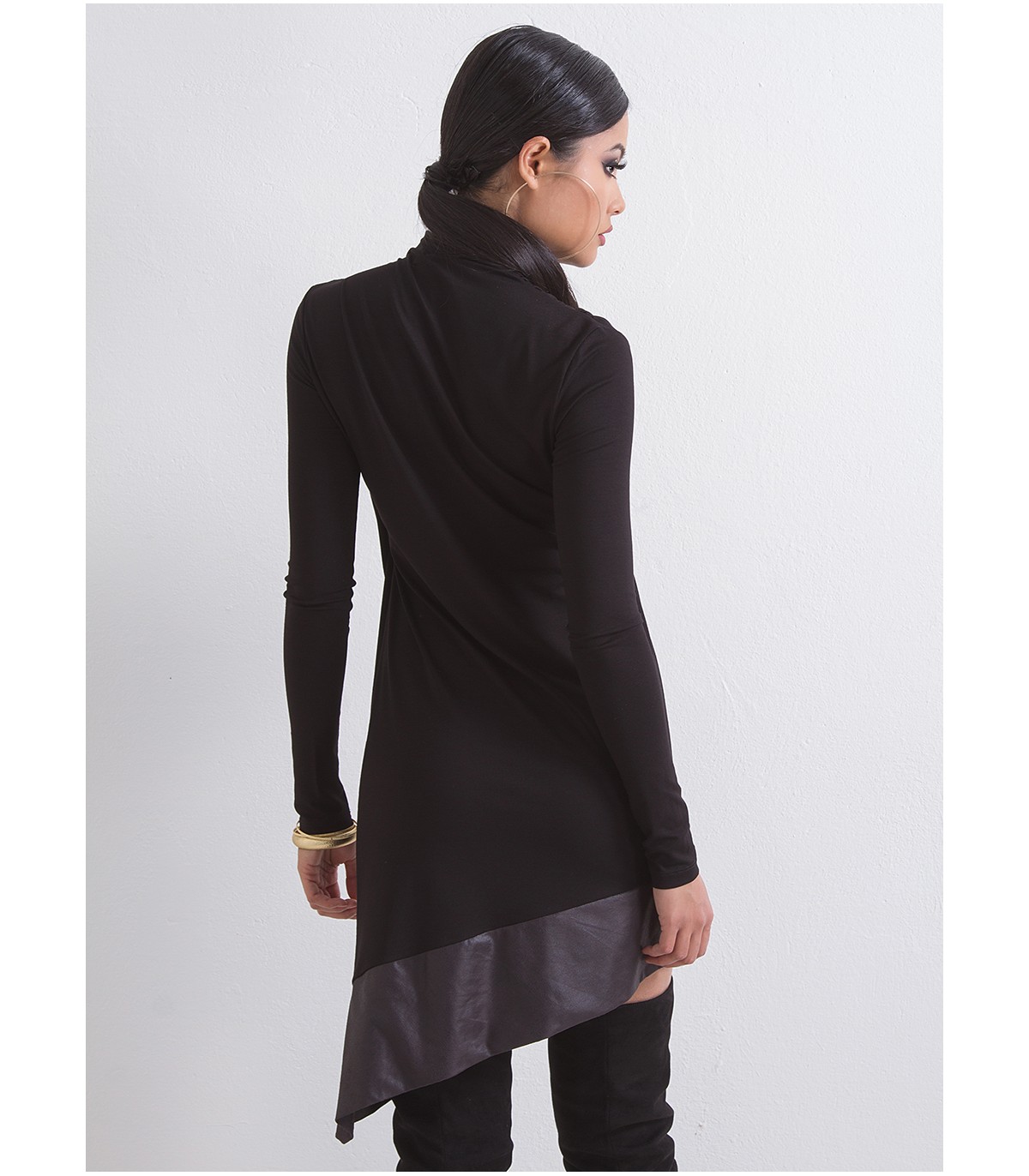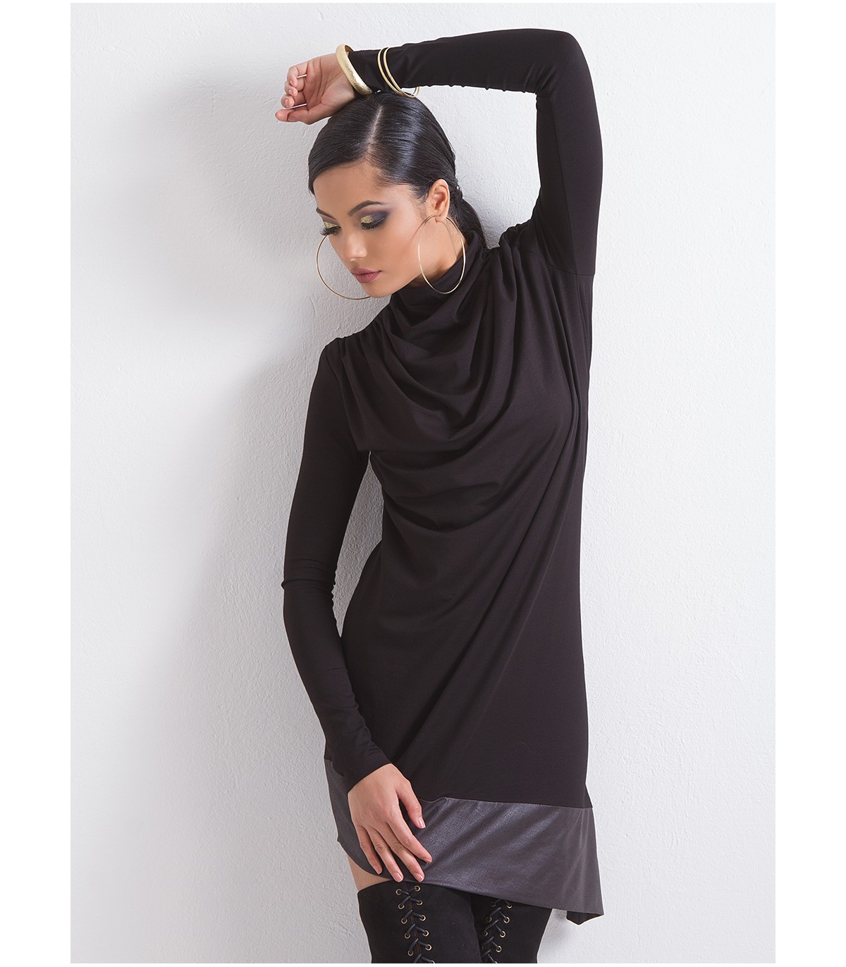 Модерна черна туника с елегантна драпирана поло яка и асиметричен силует, създадена за жени, които обичат стилна, ефектна и подчертано женствена визия. Моделът е с дълъг ръкав, прилепнала линия и акцент от еко кожа в долната част, който придава модерен и леко edgy вид.
