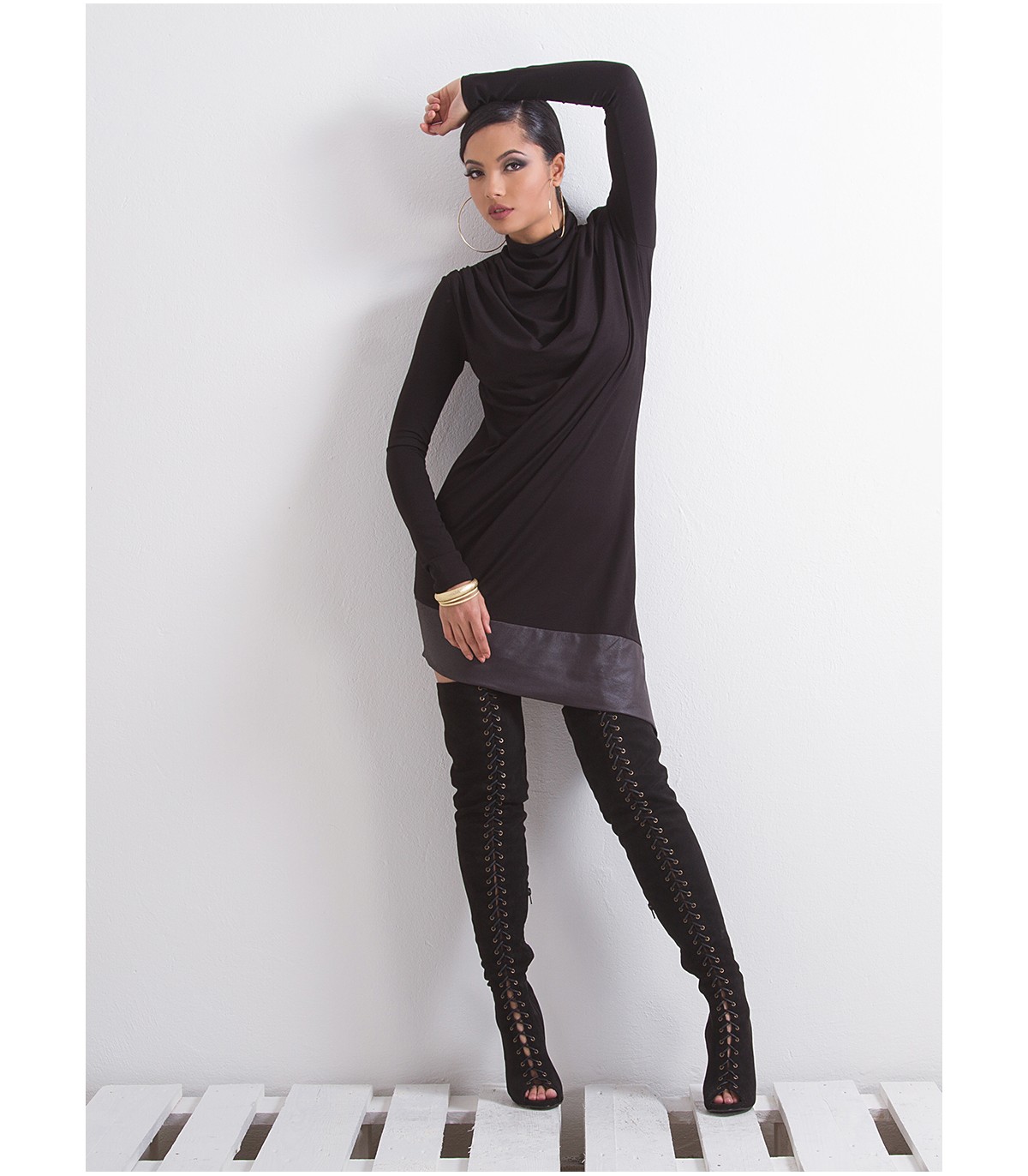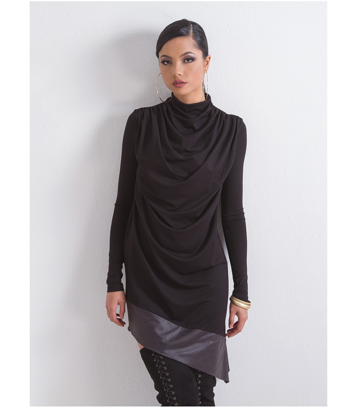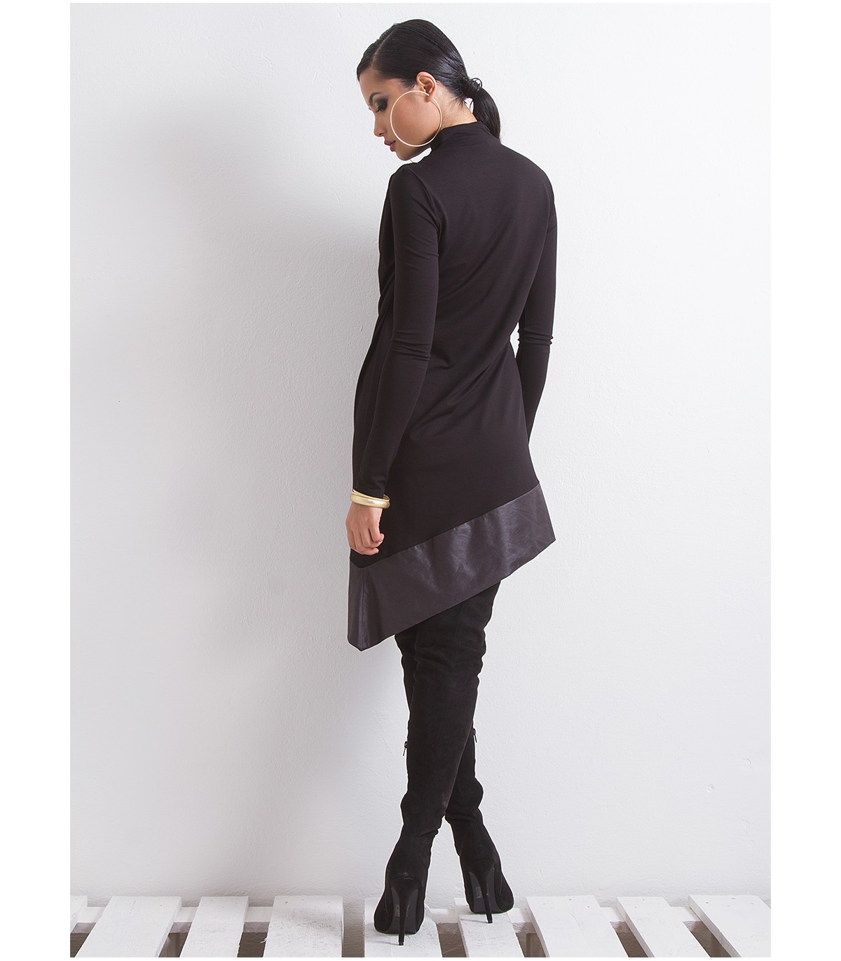 Модерна черна туника с елегантна драпирана поло яка и асиметричен силует, създадена за жени, които обичат стилна, ефектна и подчертано женствена визия. Моделът е с дълъг ръкав, прилепнала линия и акцент от еко кожа в долната част, който придава модерен и леко edgy вид.