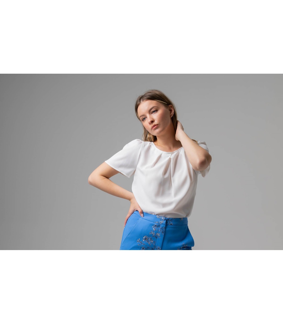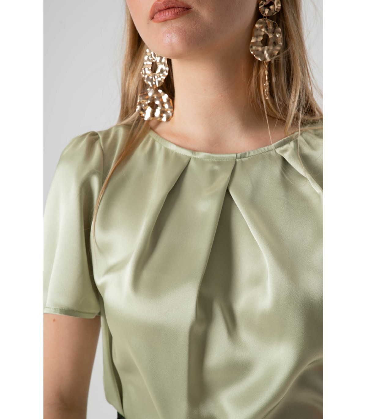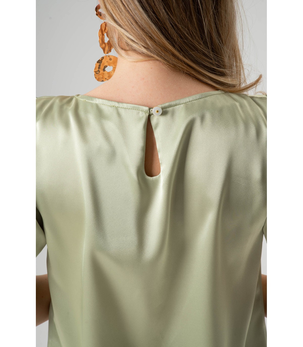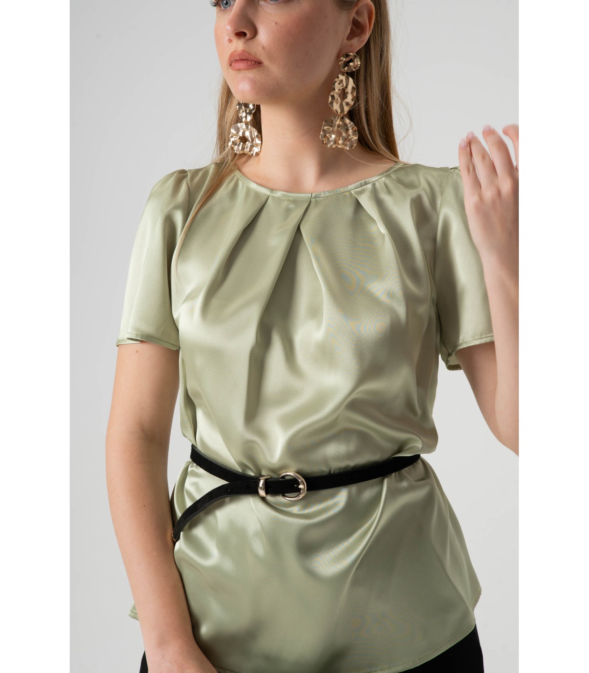Елегантна блуза с чупки от вискоза и буфан ръкав, Моделът е леко удължен, което позволява блузата да се носи над панталон с елегантен колан за по-женствена линия. Закопчава се с нежно и елегантно копченце на врата.Налична е в още шест актуални цвята: зелено.бяло. шарена щампа.бежаво. керемида и тревисто зелен,