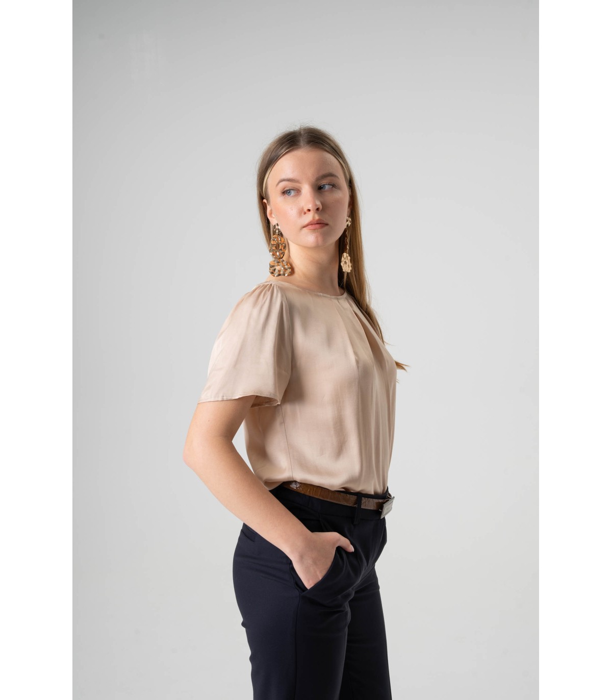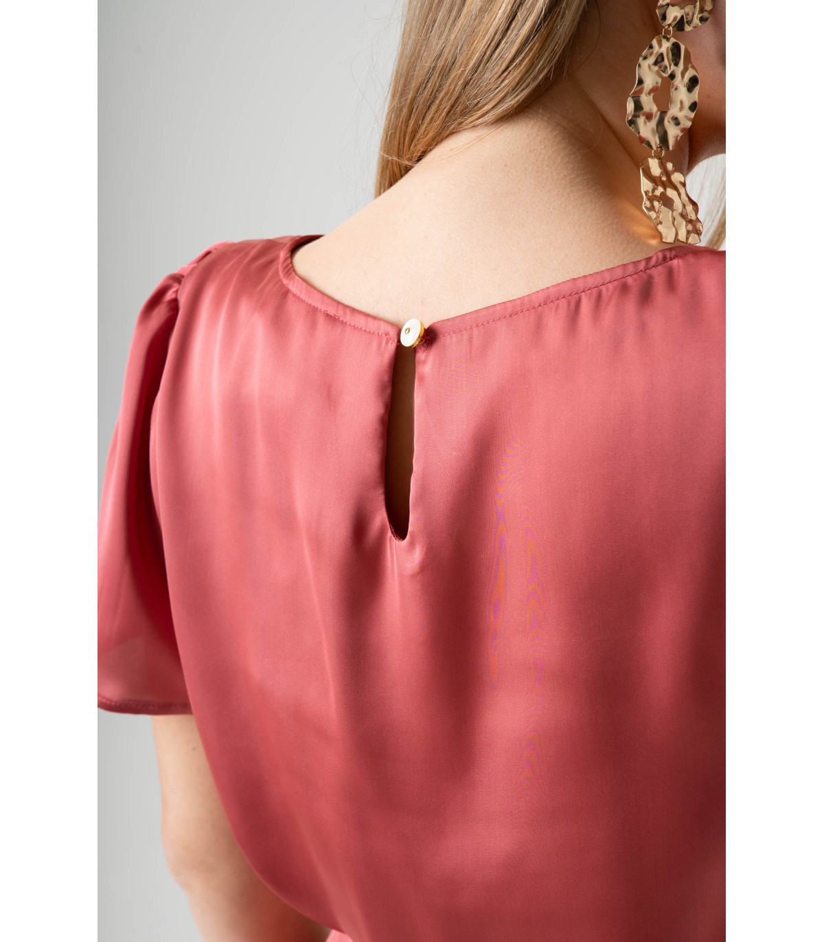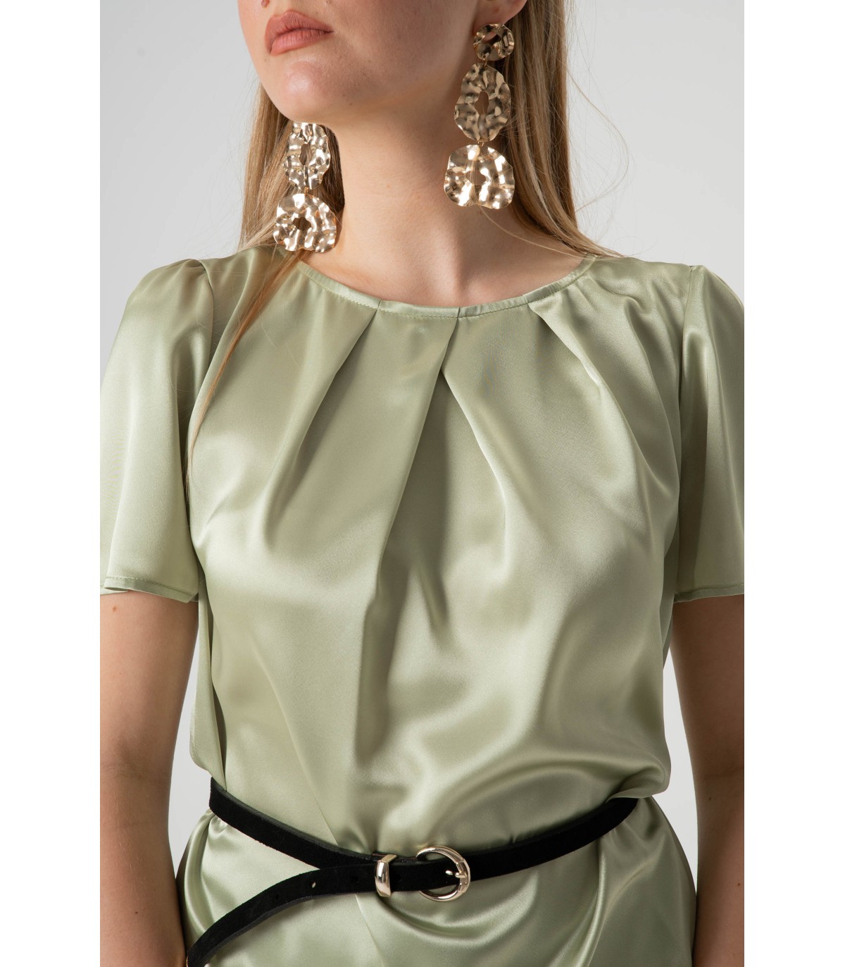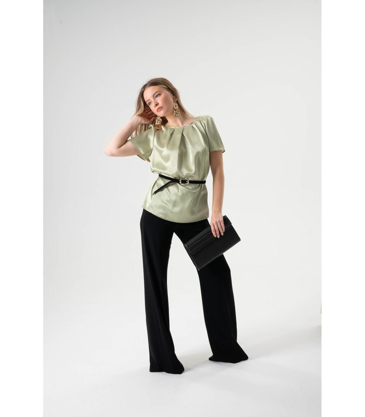 Елегантна блуза с чупки от вискоза и буфан ръкав, Моделът е леко удължен, което позволява блузата да се носи над панталон с елегантен колан за по-женствена линия. Закопчава се с нежно и елегантно копченце на врата.Налична е в още шест актуални цвята: зелено.бяло. шарена щампа.бежаво. керемида и тревисто зелен,