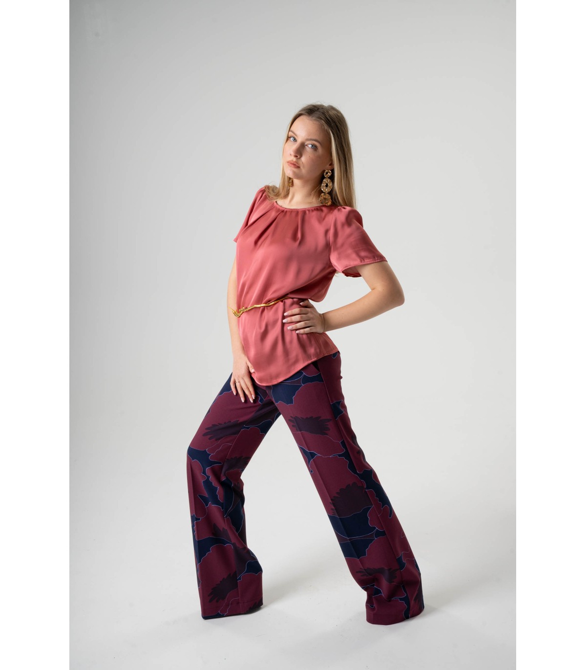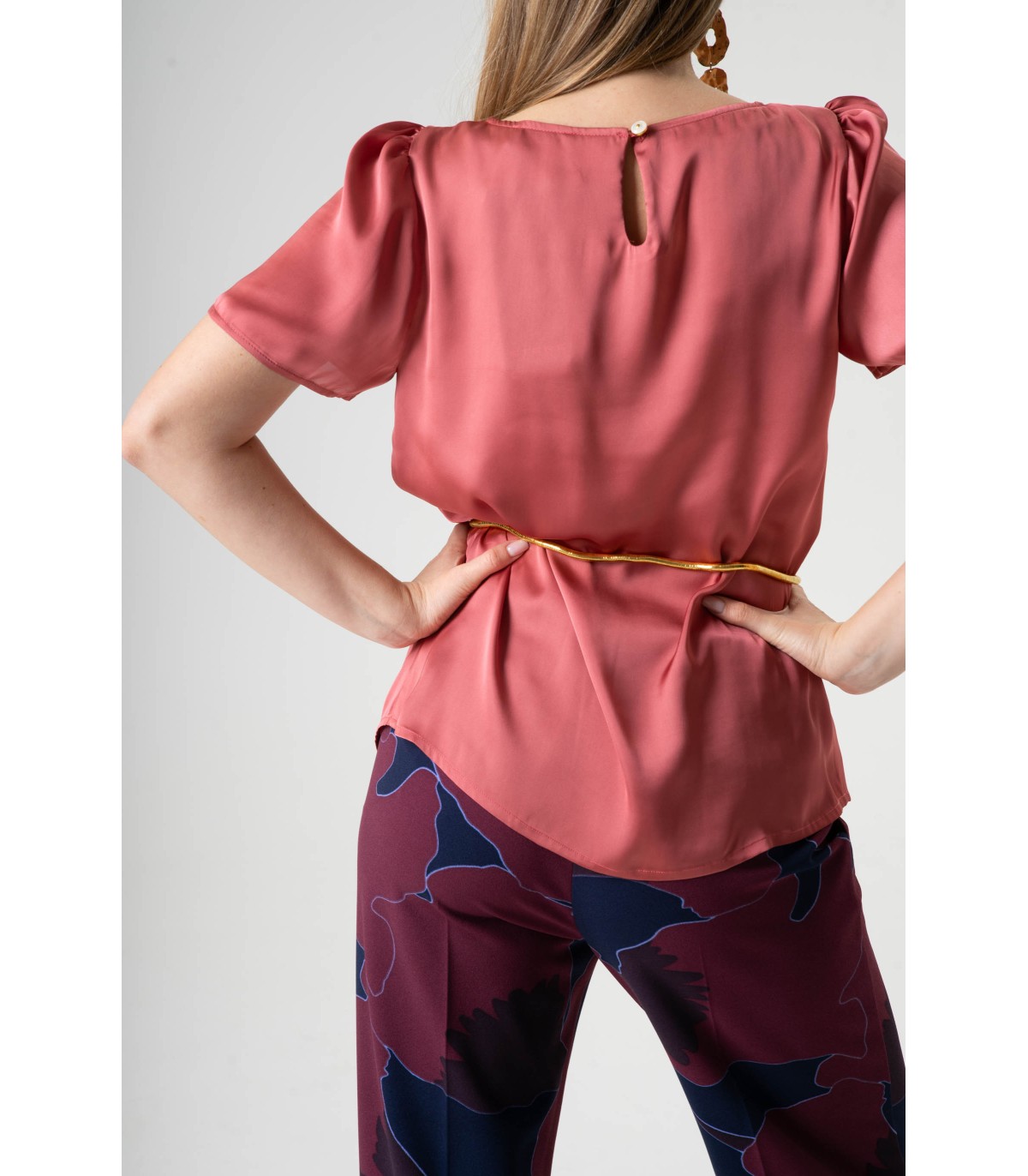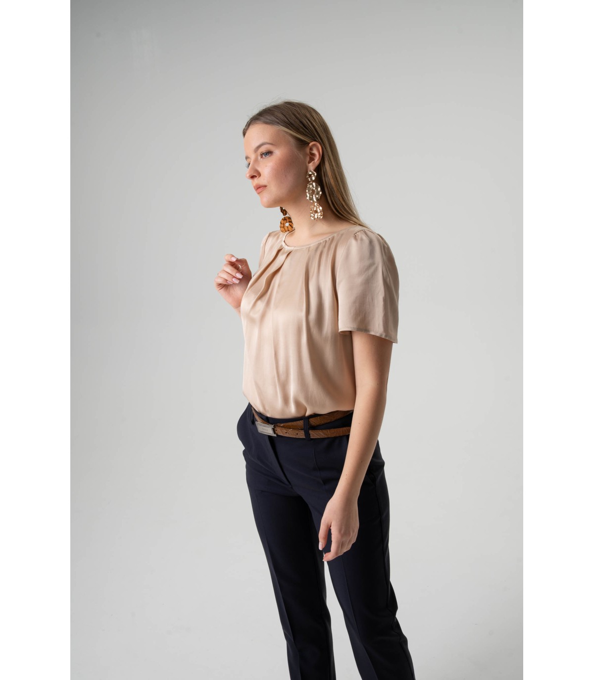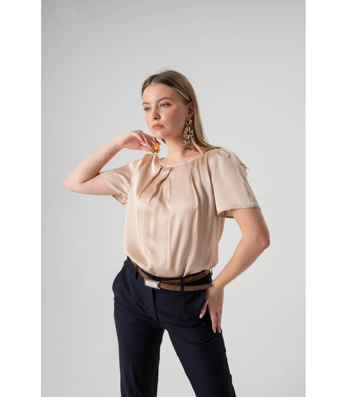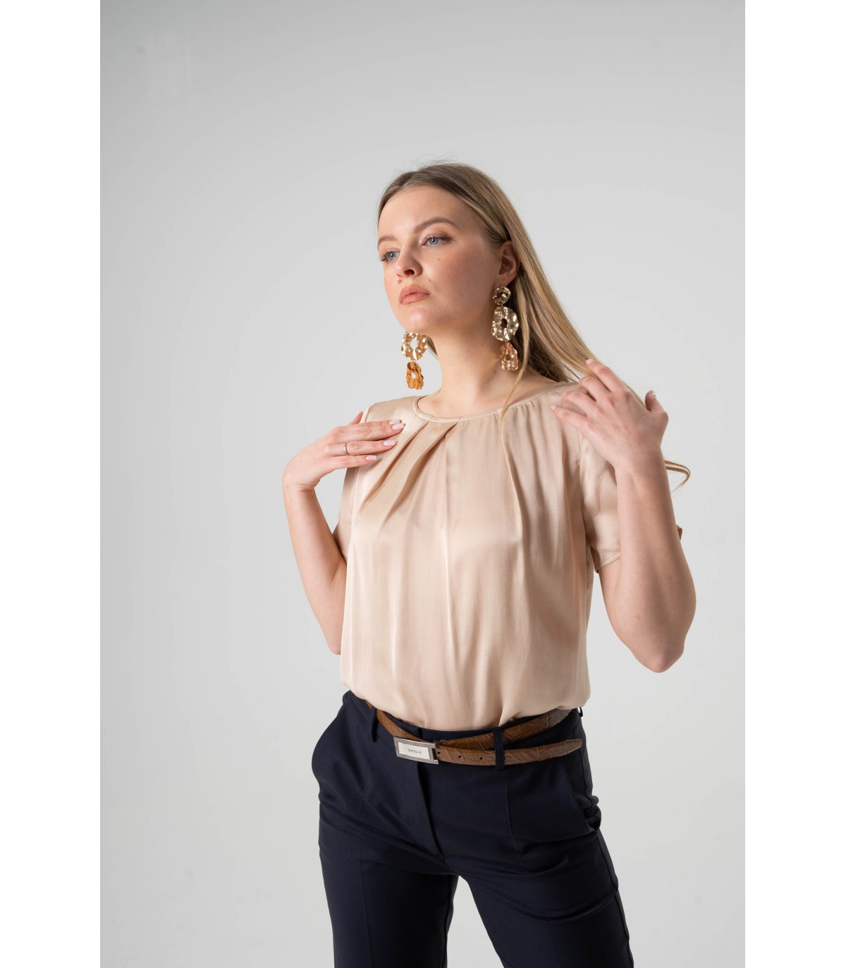 Елегантна блуза с чупки от вискоза и буфан ръкав, Моделът е леко удължен, което позволява блузата да се носи над панталон с елегантен колан за по-женствена линия. Закопчава се с нежно и елегантно копченце на врата.Налична е в още шест актуални цвята: зелено.бяло. шарена щампа.бежаво. керемида и тревисто зелен,