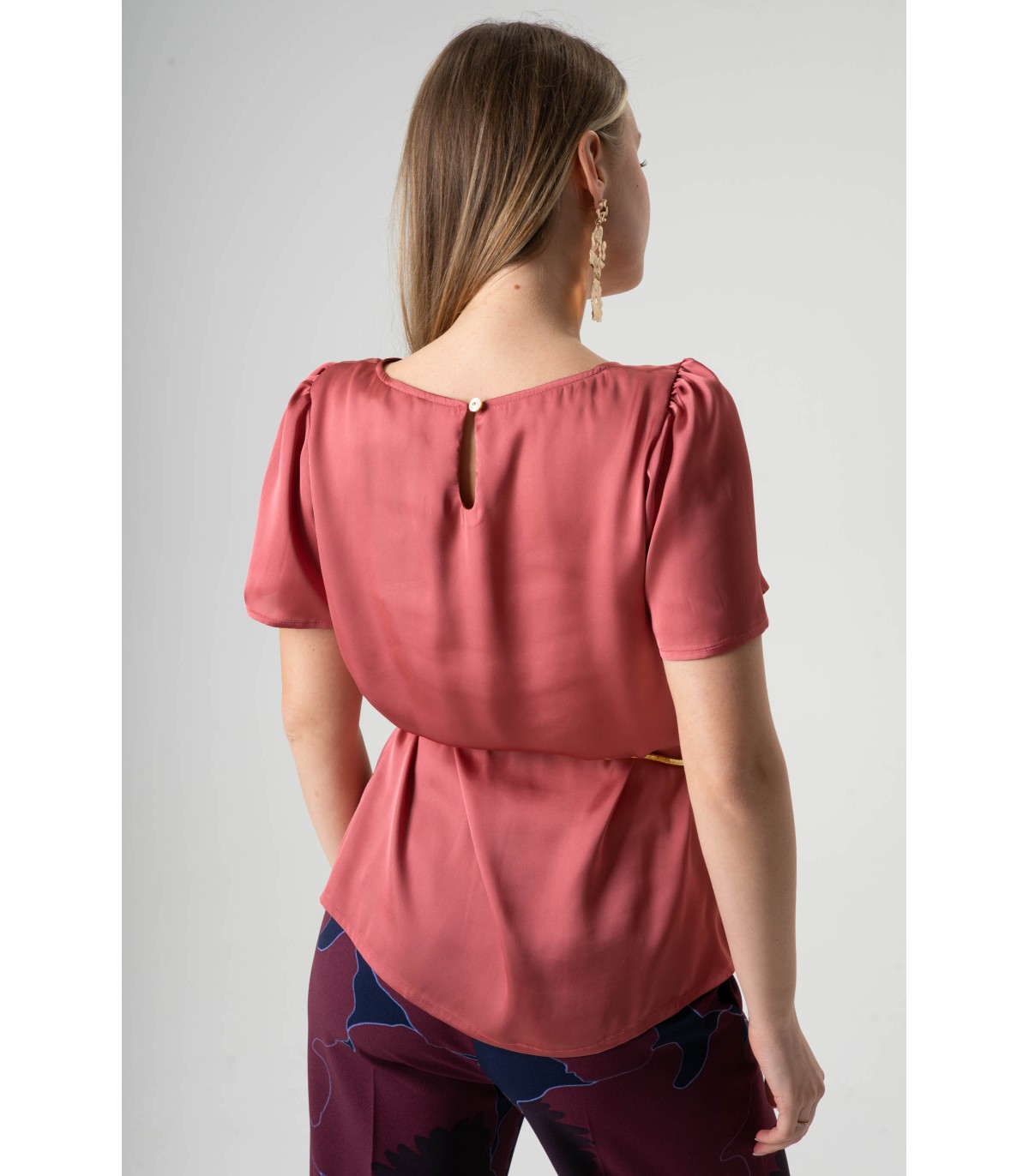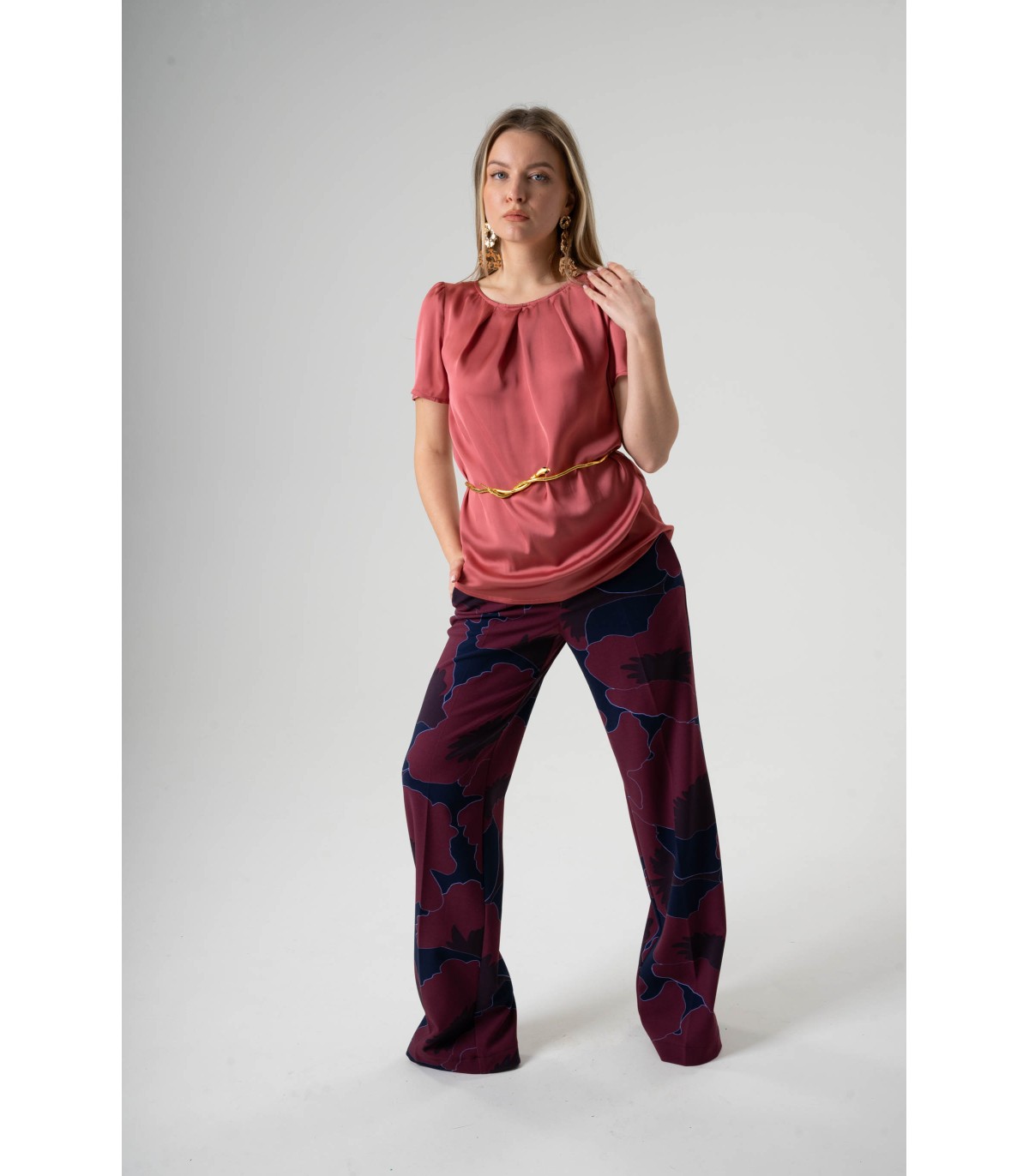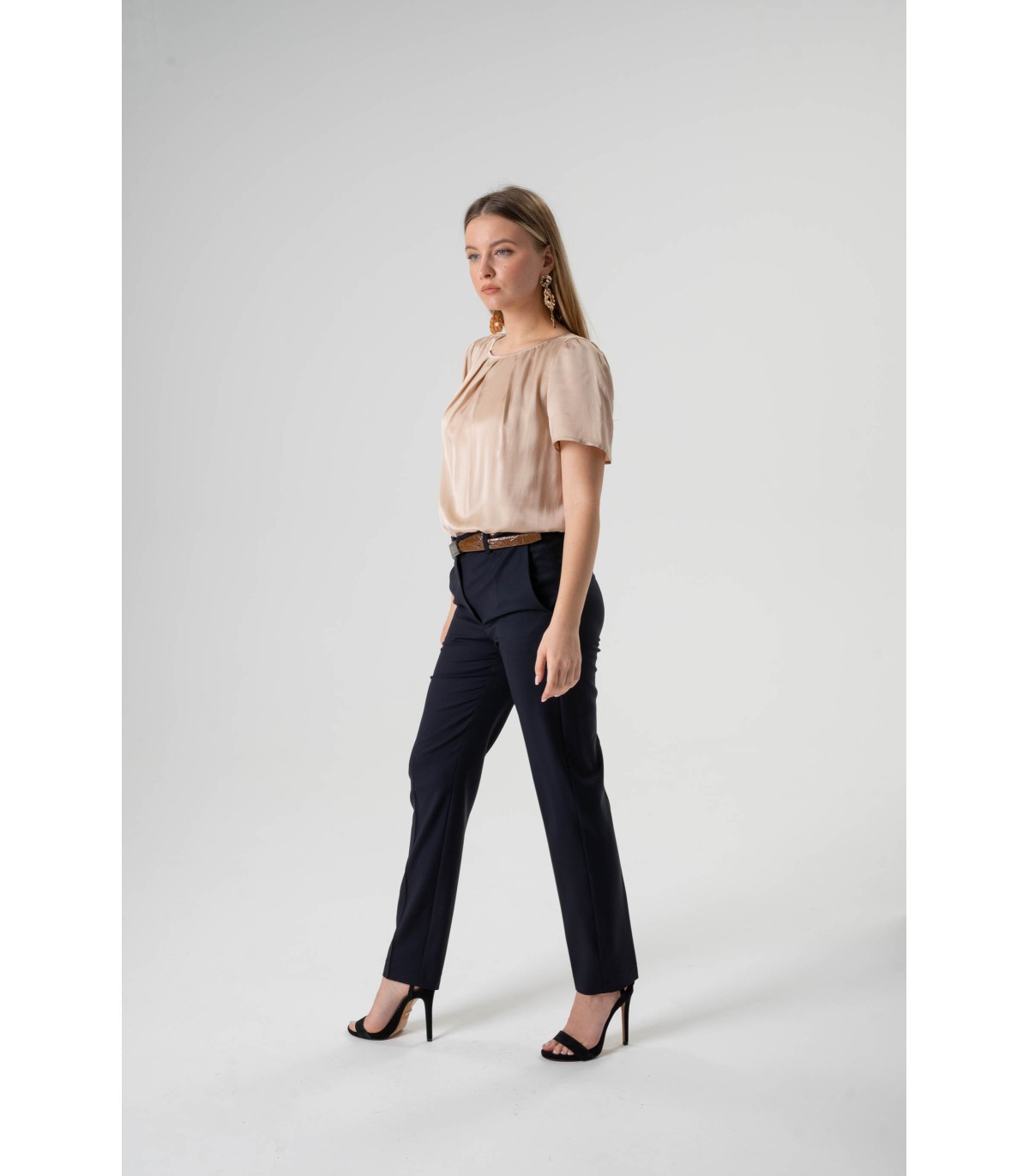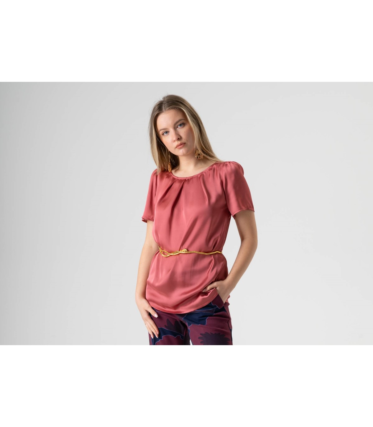 Елегантна блуза с чупки от вискоза и буфан ръкав, Моделът е леко удължен, което позволява блузата да се носи над панталон с елегантен колан за по-женствена линия. Закопчава се с нежно и елегантно копченце на врата.Налична е в още шест актуални цвята: зелено.бяло. шарена щампа.бежаво. керемида и тревисто зелен,