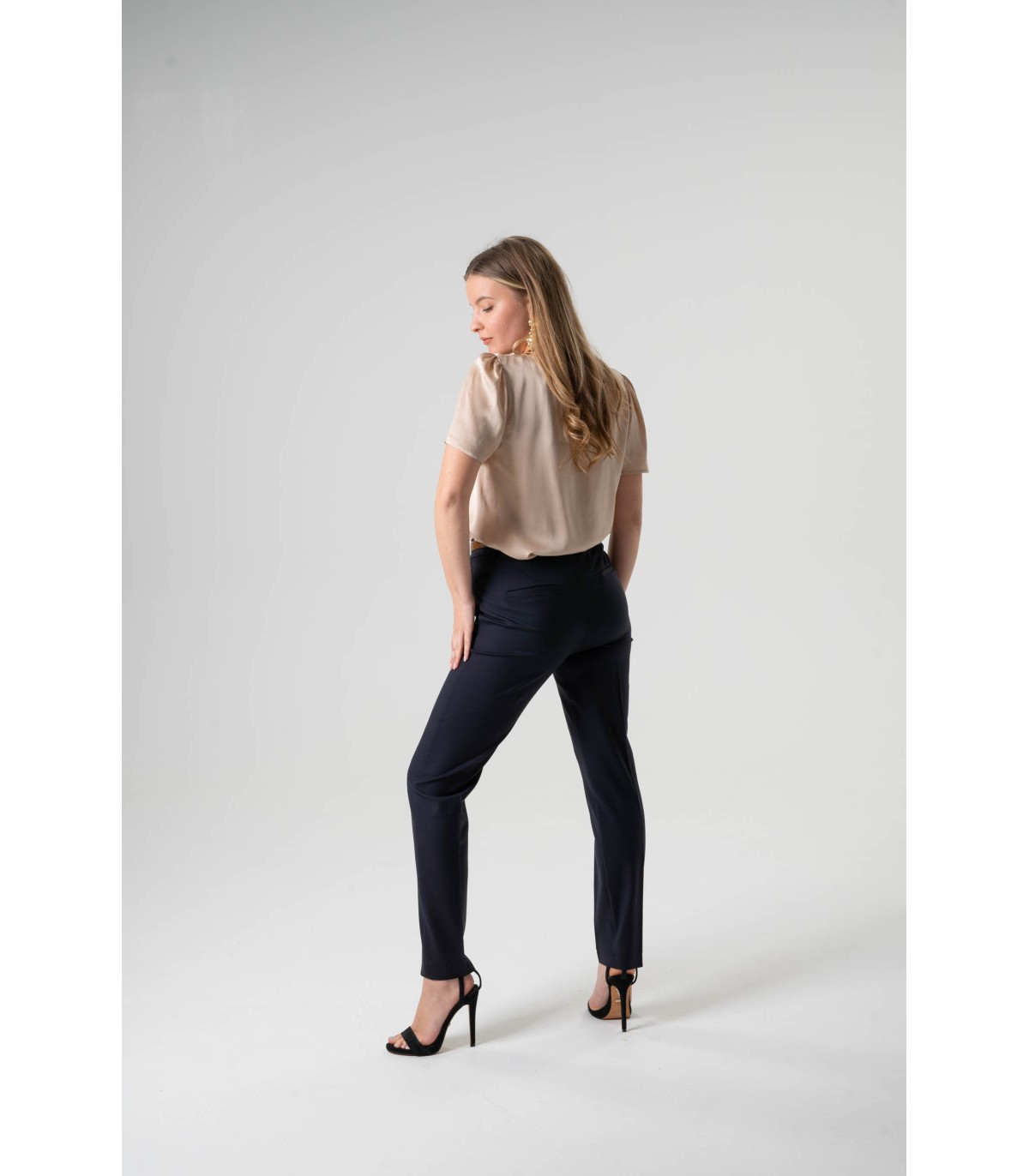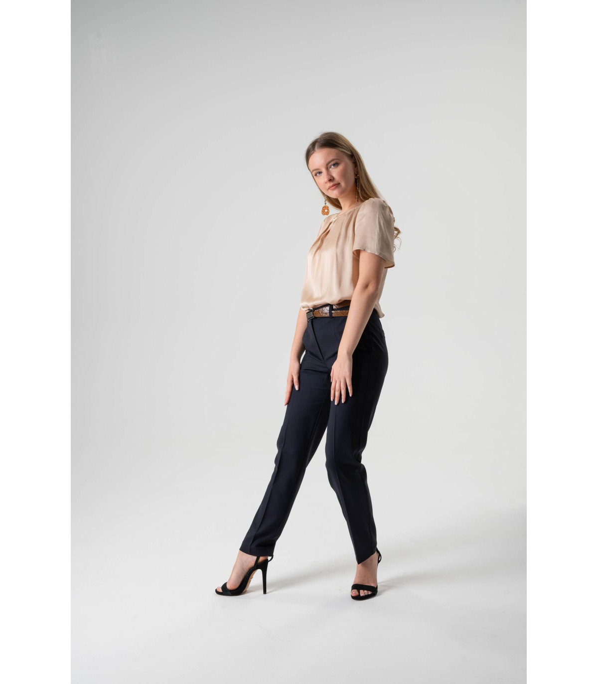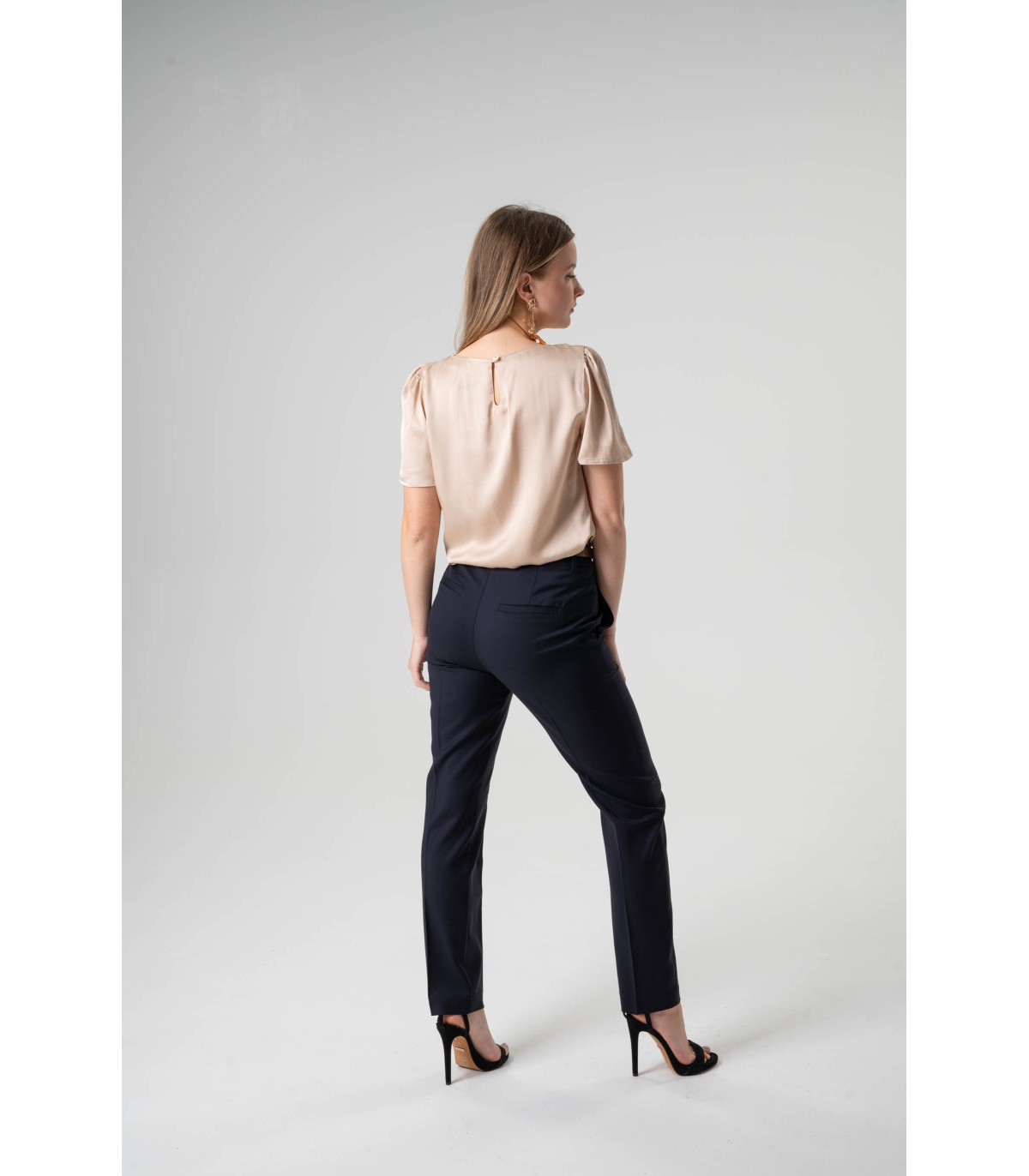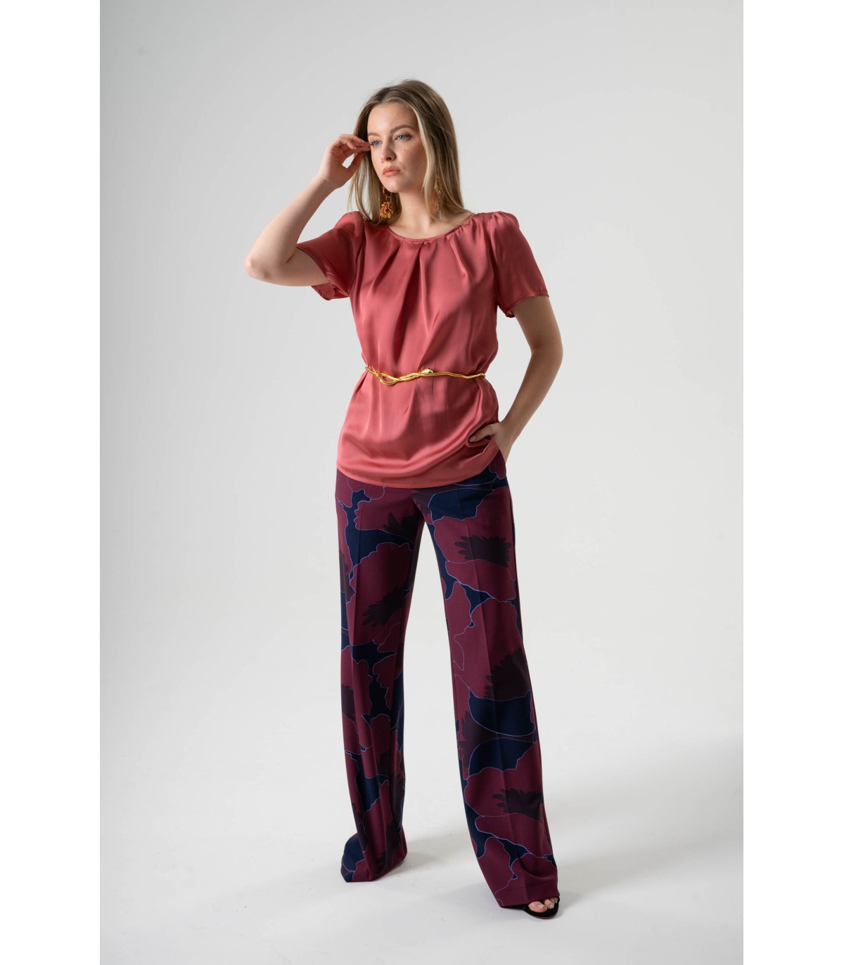 Елегантна блуза с чупки от вискоза и буфан ръкав, Моделът е леко удължен, което позволява блузата да се носи над панталон с елегантен колан за по-женствена линия. Закопчава се с нежно и елегантно копченце на врата.Налична е в още шест актуални цвята: зелено.бяло. шарена щампа.бежаво. керемида и тревисто зелен,