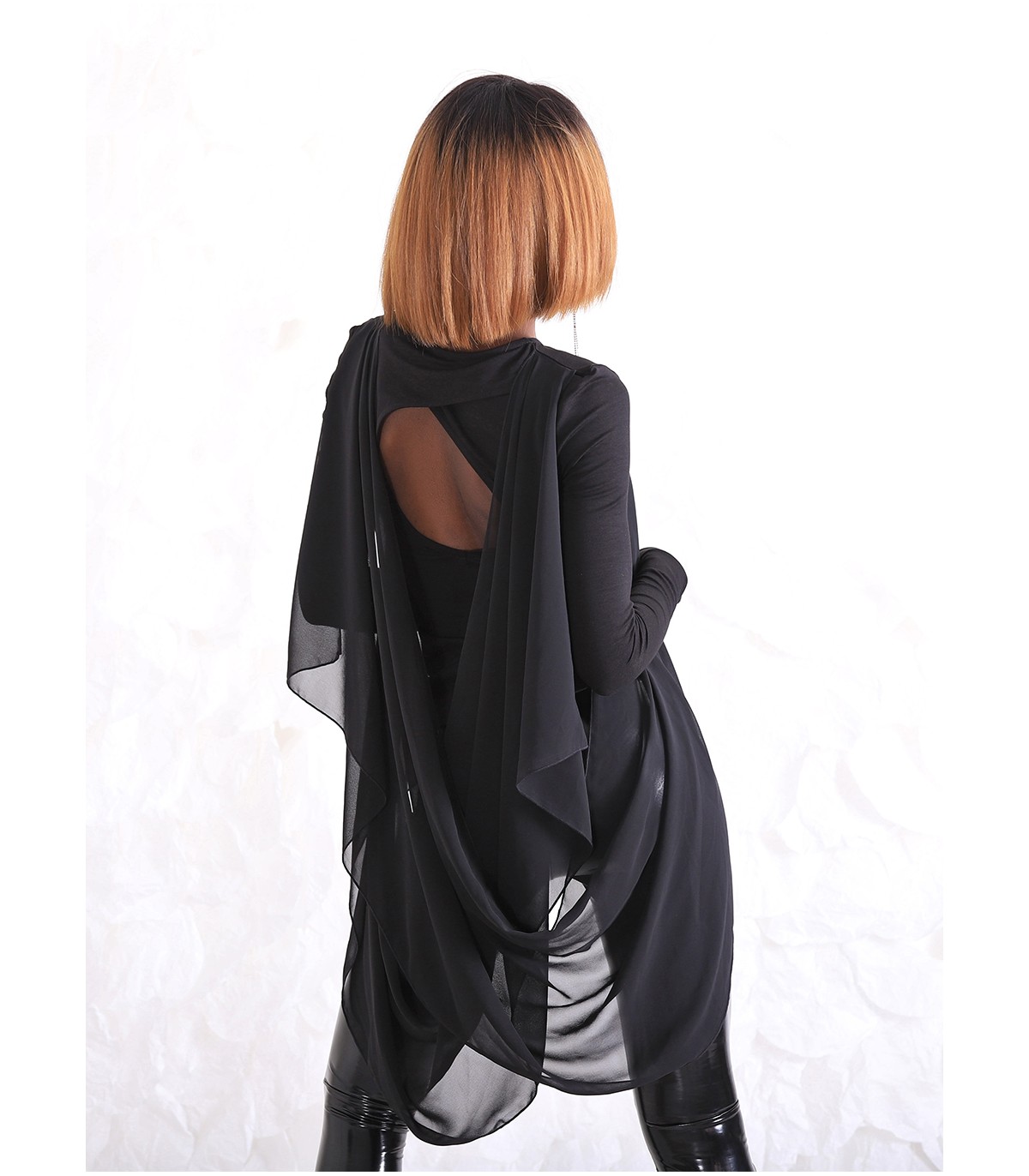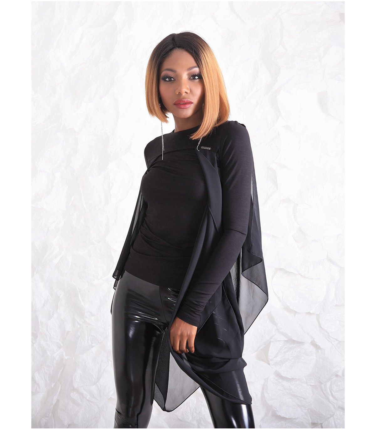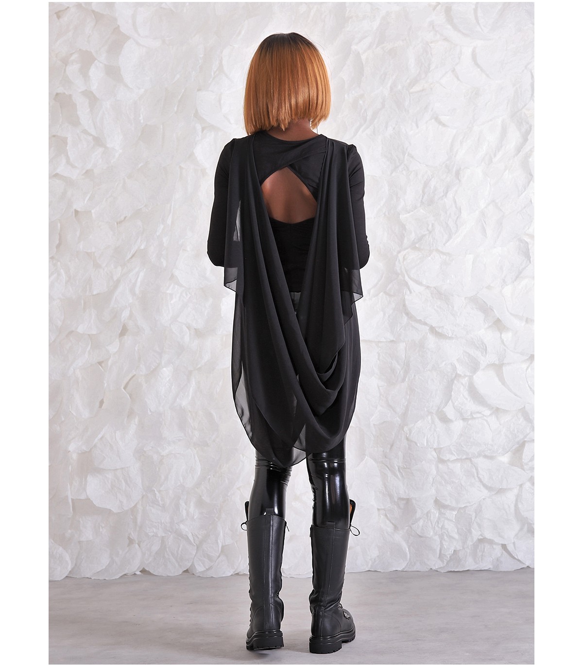 Криле от фина мрежа придават артистичен и леко драматичен силует, а черният цвят я прави универсална за комбиниране – с еко кожа, поли, клинове и панталони с висока талия.