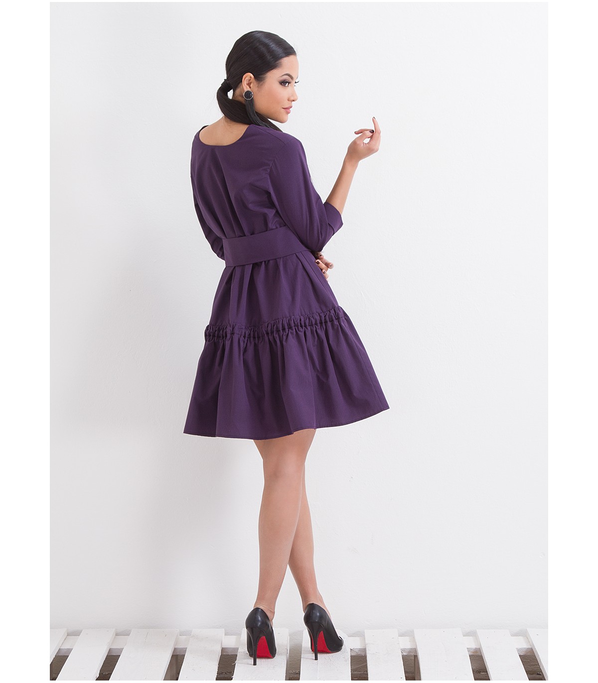 Елегантна лилава рокля от висококачествен плат, с дължина над коляното, разкроена пола и панделка за красиво оформяне на талията. Подходяща за ежедневие, офис и специални поводи. Предлага се и по индивидуални размери.
